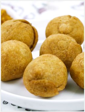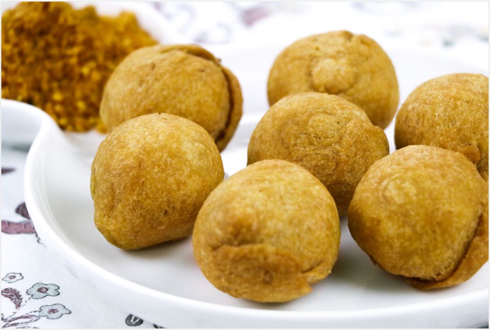 A DEEP FRIED CRISPY AND CRUNCHY BALLS OF ALL PURPOSE FLOUR STUFFED WITH SPICY MIX OF GRAM FLOUR AND OTHER SPICES
